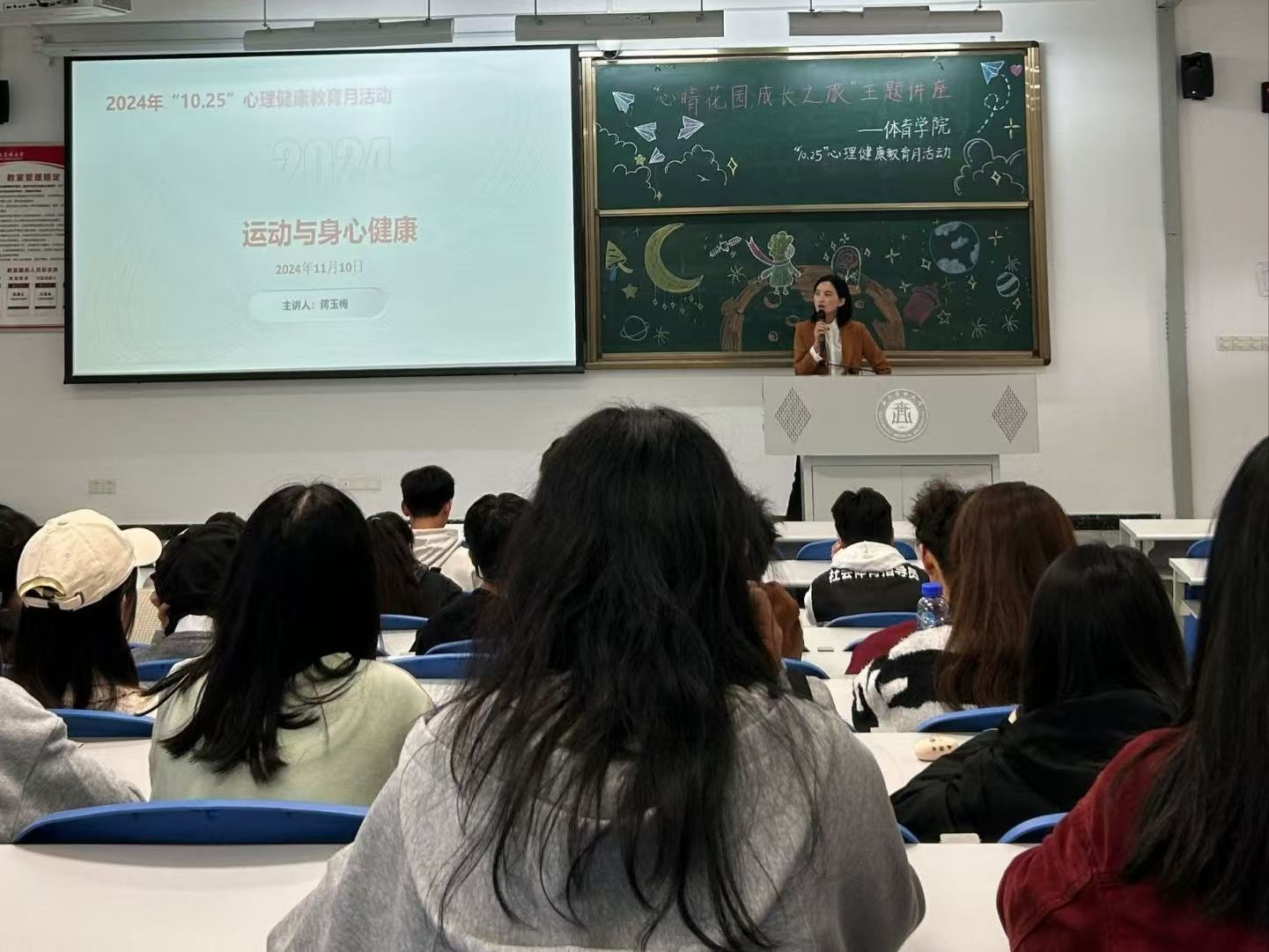 2024年11月10日,体育学院在学海楼502举行主题10·25心理健康教育月系列活动之“心晴花园,成长之旅”心理讲座,讲座由西南医科大学学生心理健康教育与咨询中心主任蒋玉梅主讲,体育学院学生会干部和全体心理委员参加讲座。