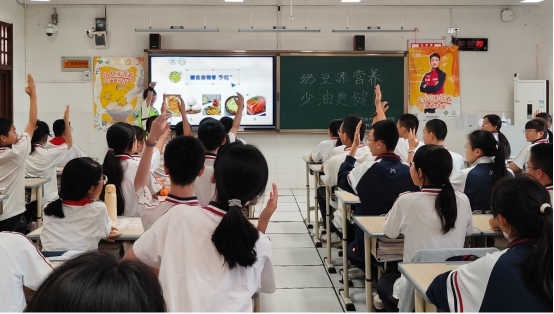 团队成员潘妍向同学们普及添加奶豆和少油的重要性,并弘扬了绿色健康生活理念,让学生加深对油、豆、奶的了解,在劳动和日常饮食中树立健康的饮食观念,传承、发扬优秀的中华饮食文化。
