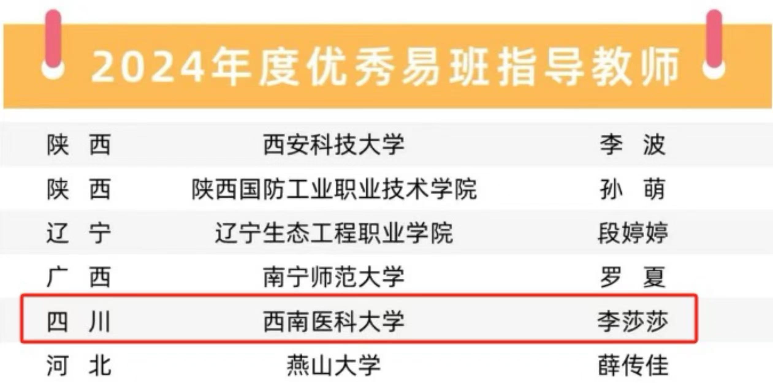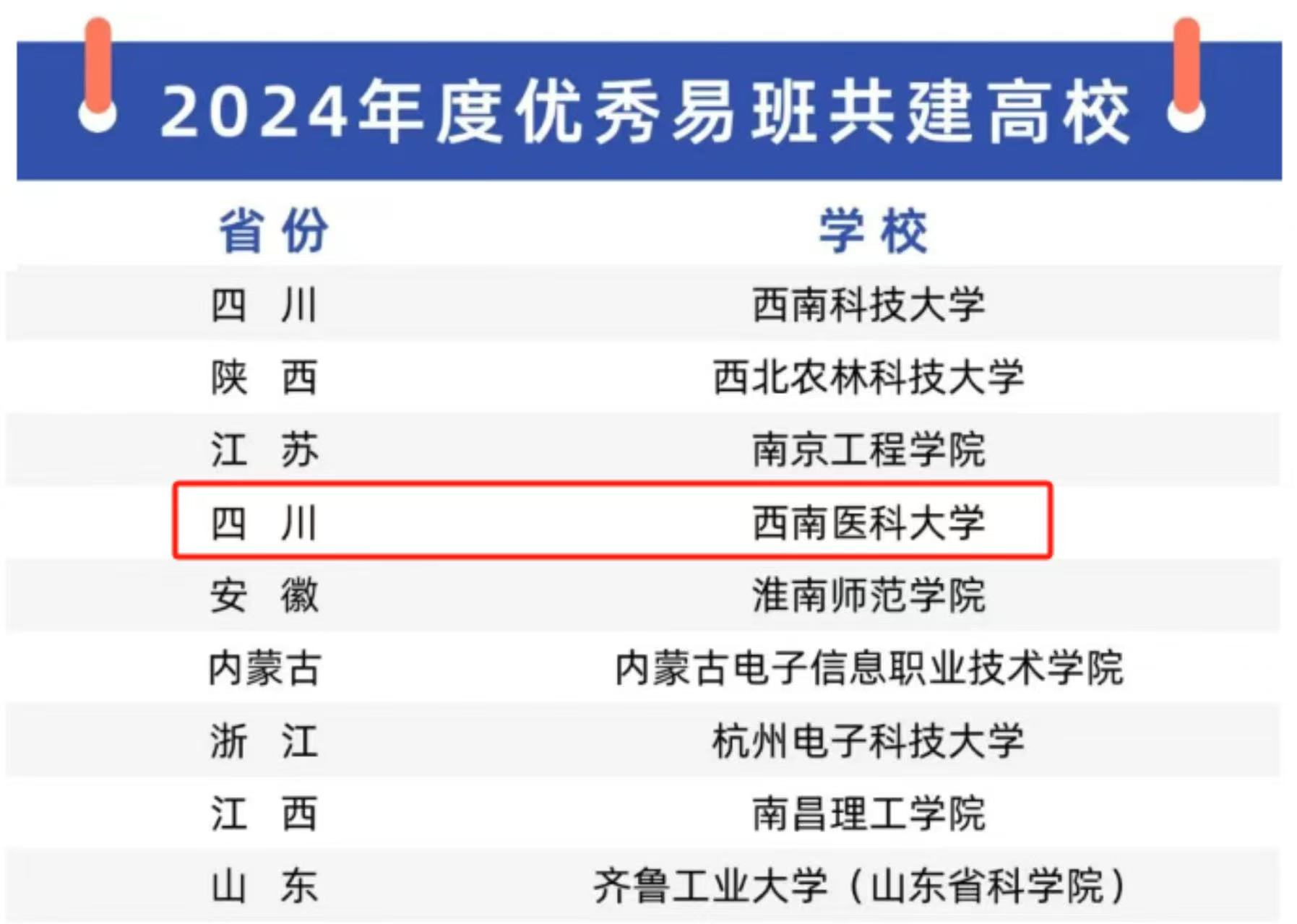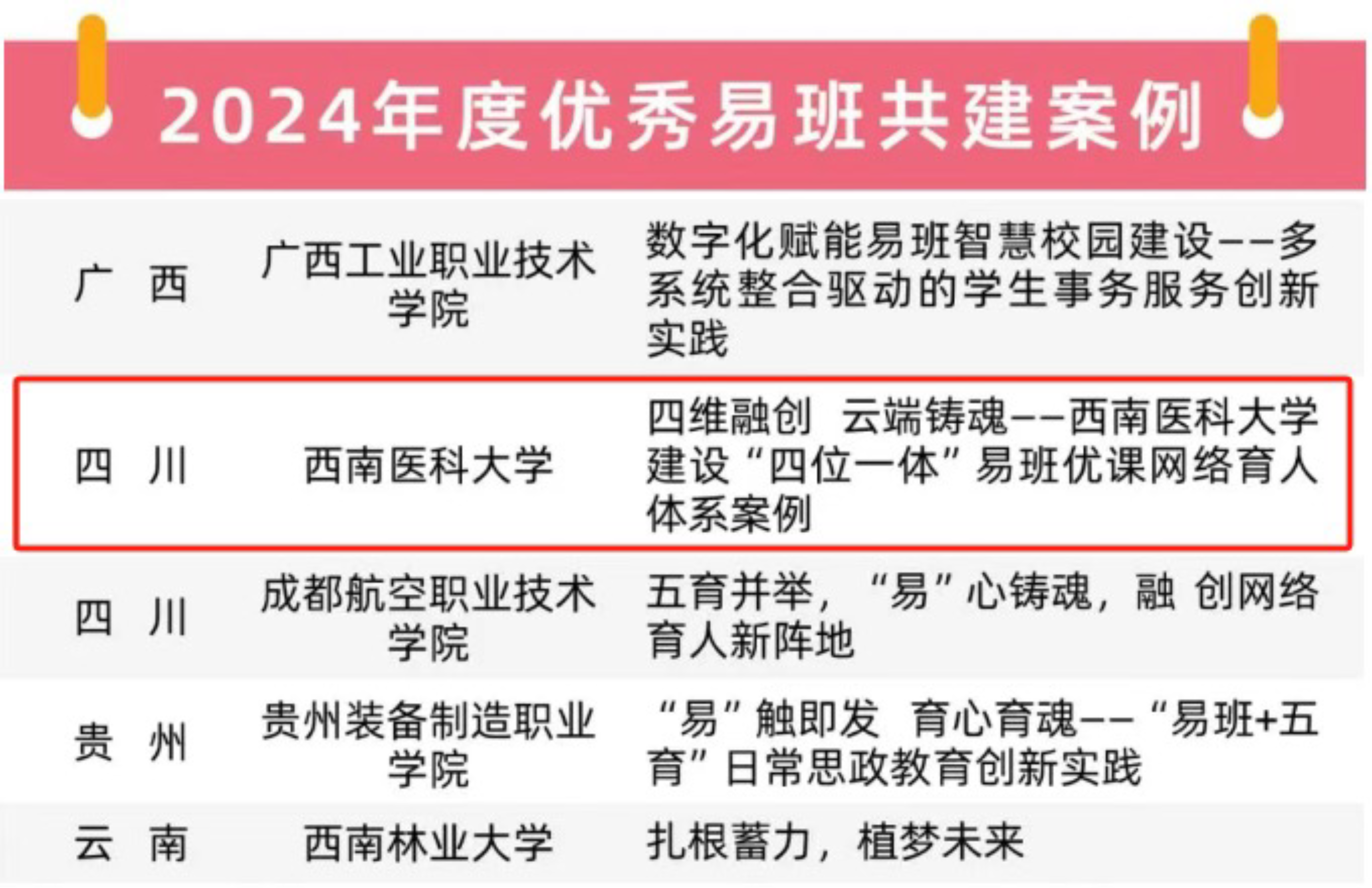 6月13日,教育部易班发展中心公布2024年度全国易班共建优秀名单,我校斩获3项荣誉。学校被评为2024年度优秀易班共建高校,《四维融创 云端铸魂——西南医科大学建设“四位一体”易班优课网络育人体系案例》被评为全国优秀易班共建案例,李莎莎被评为2024年度优秀易班指导教师。