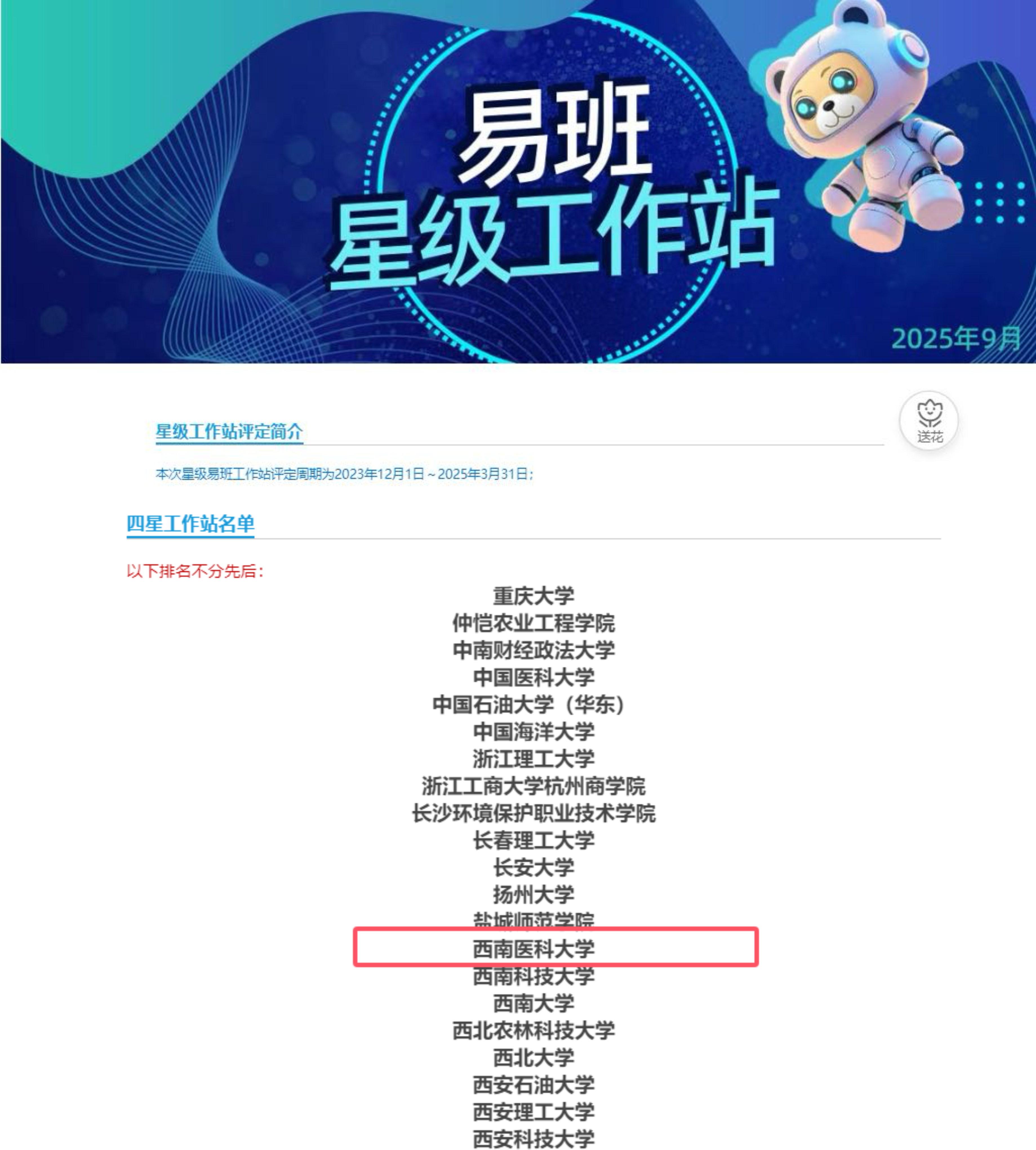 近日,教育部易班发展中心公布了2025年度全国易班星级工作站名单,我校易班学生工作站凭借扎实的工作成效和突出的平台表现,荣获“全国四星级工作站”称号。本次在全国1876所易班共建高校中共确定星级工作站358个,其中五星级16个、四星级130个、三星级212个。