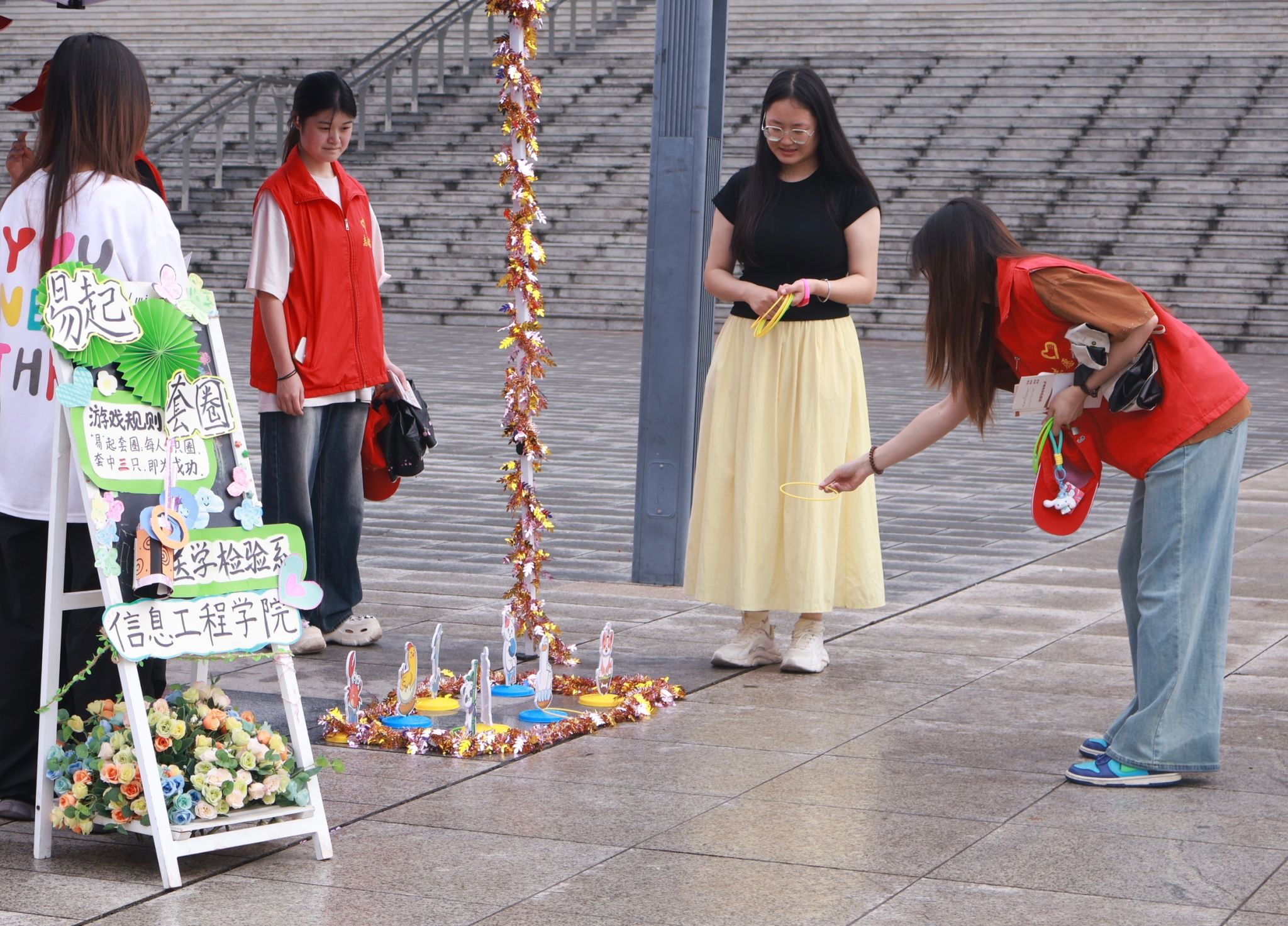 5月18日,线下“易起游园会”在城北校区青年体育馆广场上开展,吸引了400余名同学参与。活动现场设置了6个游戏站点,涵盖12个院系易班分站负责的特色游戏。在“‘易’守难攻”游戏中,同学们抽取科普知识谣言卡,快速判断真假并阐述理由,既考验知识储备又锻炼反应能力;“‘易’箭入壶”让大家体验传统射艺的魅力,感受专注与力量的结合;“‘易’器快答” 通过猜器官游戏,普及人体知识;“‘易’起套圈”环节,同学们凭借熟练技巧,赢取阵阵喝彩。还有结合专业特色的“‘易’起猜谜”,以及充满挑战的“‘易’战拼图”,每个游戏都独具匠心,充分展现了易班各分站的专业特色与创新能力。