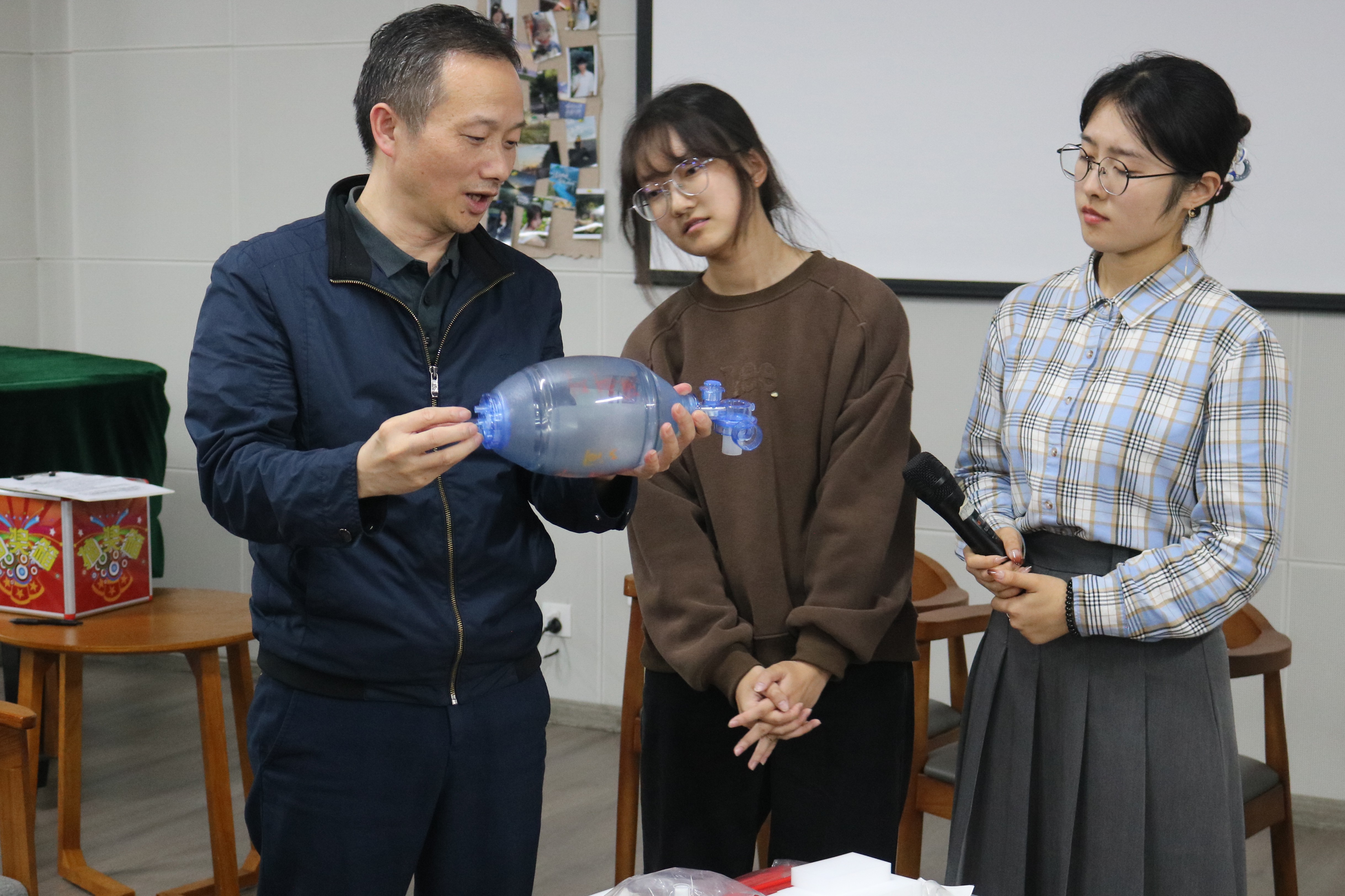 活动包含三项核心环节:首先是“匿名纸条接龙”,提前收集同学对麻醉学的疑问,由班主任随机抽取并结合经验答疑,既拉近师生距离又消解了新生对专业的片面理解;接着是“班主任职场故事”,老师与师兄师姐分享危重症抢救、疼痛管理等一线案例,展现麻醉学科的临床深度与人文温度,让同学明白麻醉是守护生命的关键;最后是“新手‘小操作’体验”,老师先演示医疗器械操作,再邀请同学角色扮演体验,极大激发参与热情,让现场充满探索氛围。