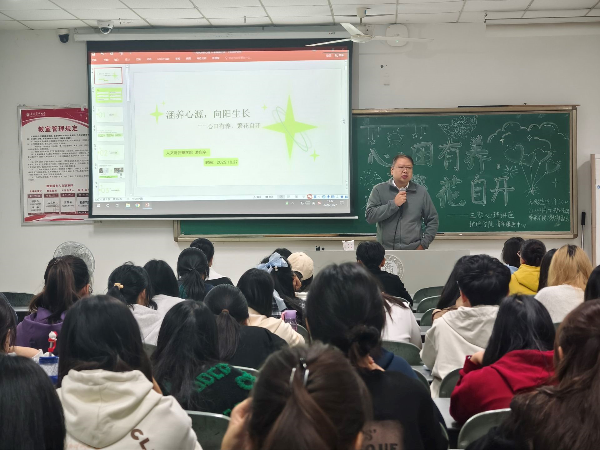 为帮助学生更好地应对大学阶段的压力与迷茫,10月27日,护理学院在海川楼601成功举办“心田有养,繁花自开”心理讲座。本次活动特邀心理辅导站游向宇老师担任主讲,共吸引100名学生积极参与,为心理健康保驾护航。