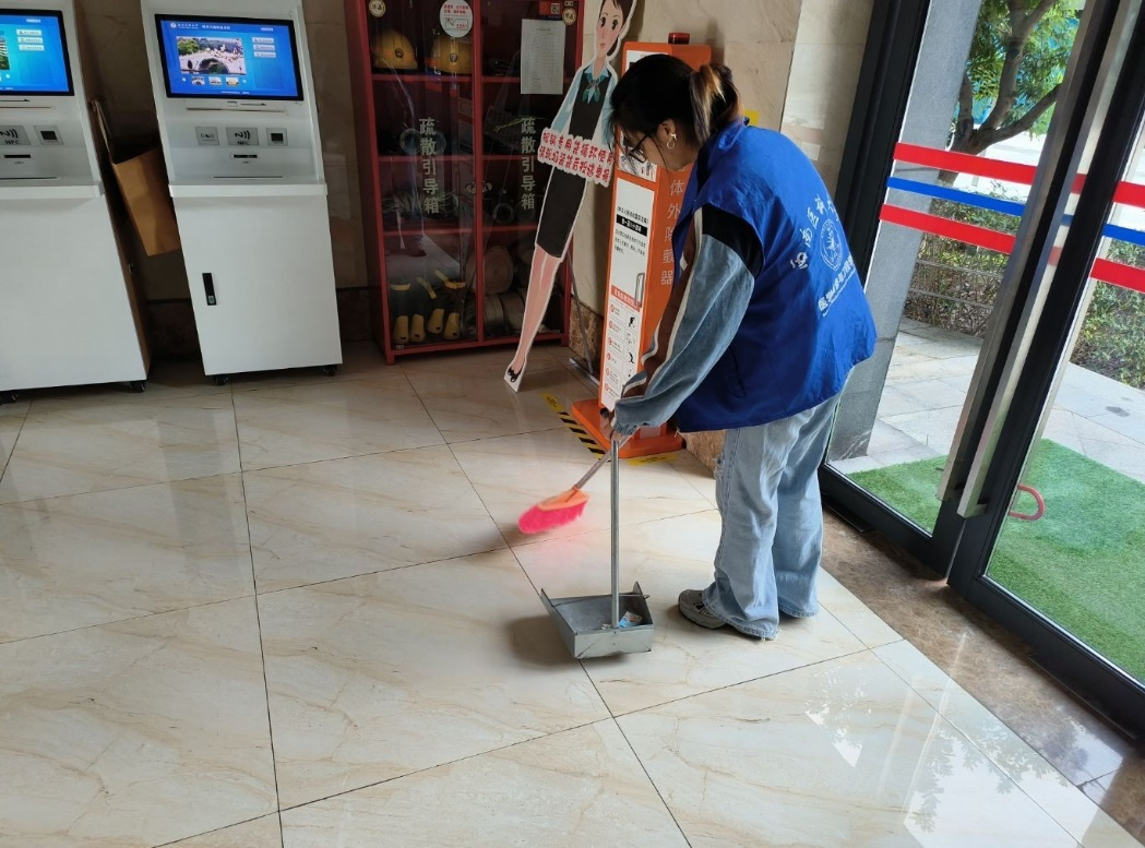 活动过程中,41名志愿者被分为七个小组,在责任区域内干劲十足地打扫起来。同学们挥动着扫帚,仔细清理路面和绿化带中的落叶与杂物,擦拭公共宣传栏和休闲长椅,并将随意停放的单车归置到指定区域有序摆放。大家干劲十足、配合默契,忙碌的身影成为校园里一道亮丽的风景线。打扫结束后,全体志愿者在校内具有建筑特色的活动区开展现场学习打卡,了解建筑历史背景与重要价值,感悟地方人文底蕴。