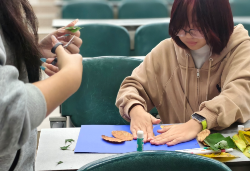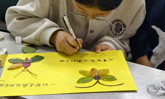 活动现场,同学们通过落叶剪贴、情绪书写的创意形式,四人为一组,围绕“落日心情文案”主题展开创作。有的同学专注修剪落叶,将秋日叶脉化作画面的灵动线条;有的同学伏案书写,把藏在心底的情绪与对生活的感悟凝练成文字。一小时的创作时光里,教室内少了往日的匆忙,多了笔尖摩挲、落叶轻响的静谧,每位同学都沉浸在动手创作的乐趣中。