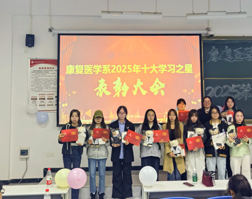 为表彰先进、树立典型,凝聚学习奋进力量,全力营造勤学善思、求真务实的优良学风。10月25日,康复医学系在学海楼举行2025年“十大学习之星”表彰大会。康复医学系学生科科长侯萍及获奖学生齐聚一堂,共赴这场以榜样力量点燃专业梦想的盛会。