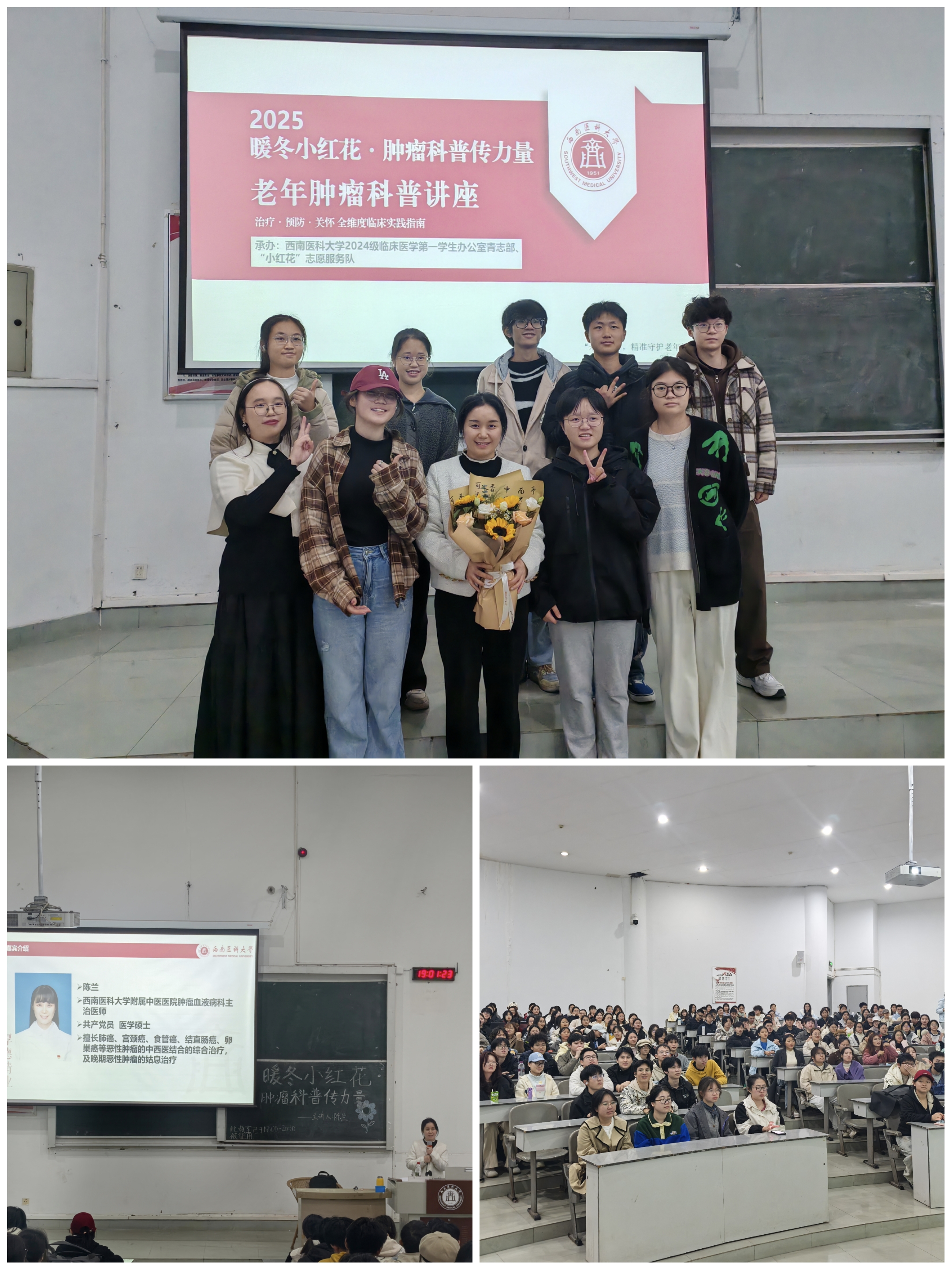 为增强医学生对老年肿瘤防治的系统认知,深化人文关怀理念,11月26日晚,基础医学院2024级一办在城北校区明理楼301教室举办了“暖冬小红花·肿瘤科普传力量”老年肿瘤科普讲座。活动吸引了近百名学生参与。