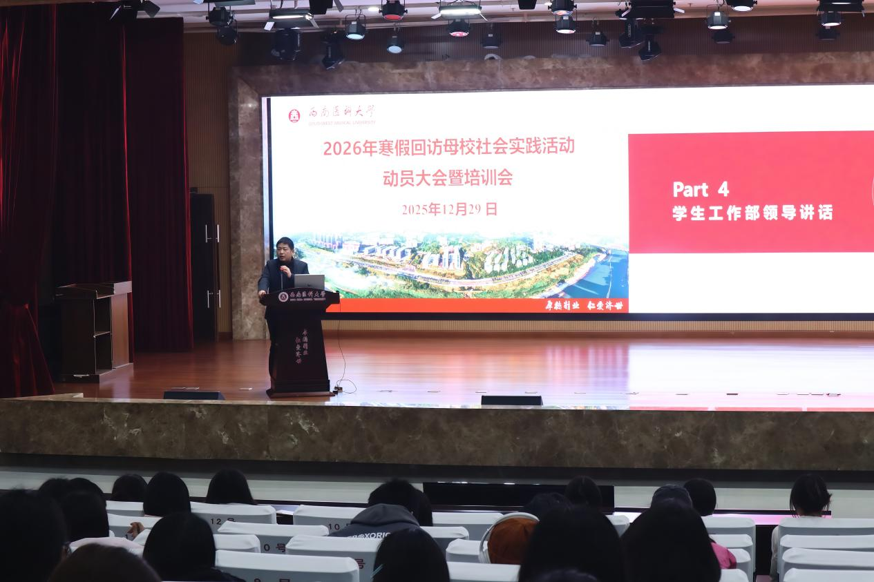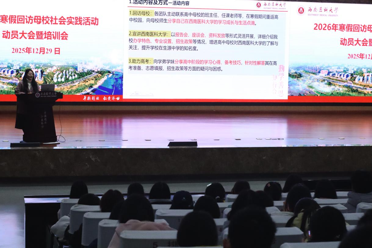 12月29日,第七届“回访母校 逐梦医大”社会实践活动动员大会暨培训会在城北校区第一学术报告厅顺利举行。招生就业处副处长范生根、招生办公室邓学梅以及各招生宣传学生团队负责人参会。