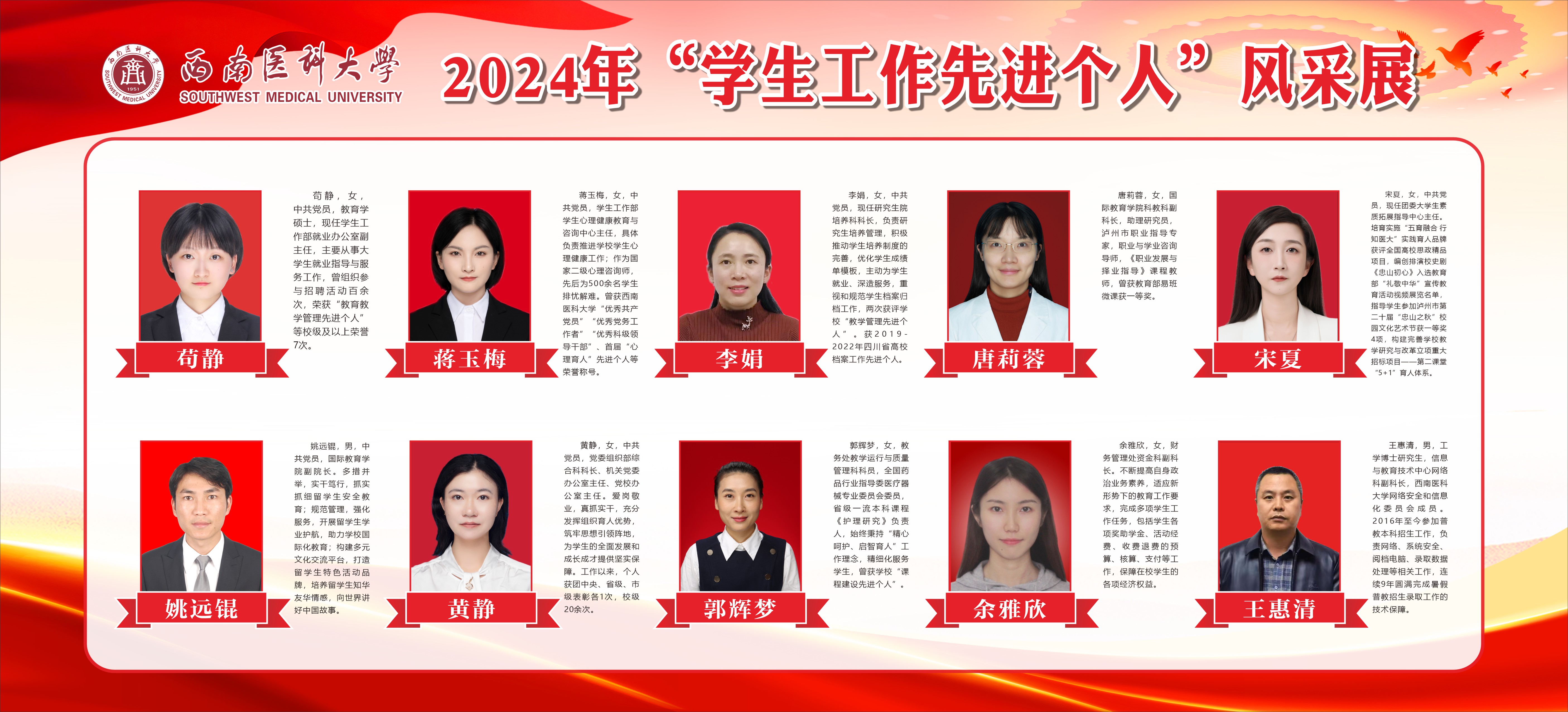 近日,西南医科大学举行了一场隆重的表彰大会,对在学生工作中表现卓越的先进个人进行了嘉奖。这些获奖者以无私的奉献精神、专业的工作素养和创新的工作方法,在学生的成长成才过程中发挥了重要作用,成为了西南医科大学学生工作的杰出典范。 在学生工作的第一线,他们既是学生思想的引领者,也是生活的关怀者。他们深入了解学生的需求和困惑,通过耐心的沟通和专业的指导,帮助学生解决学习和生活中的难题。无论是心理健康问题、学业压力还是职业规划的迷茫,他们总是以温暖的态度和专业的知识给予学生支持和鼓励。