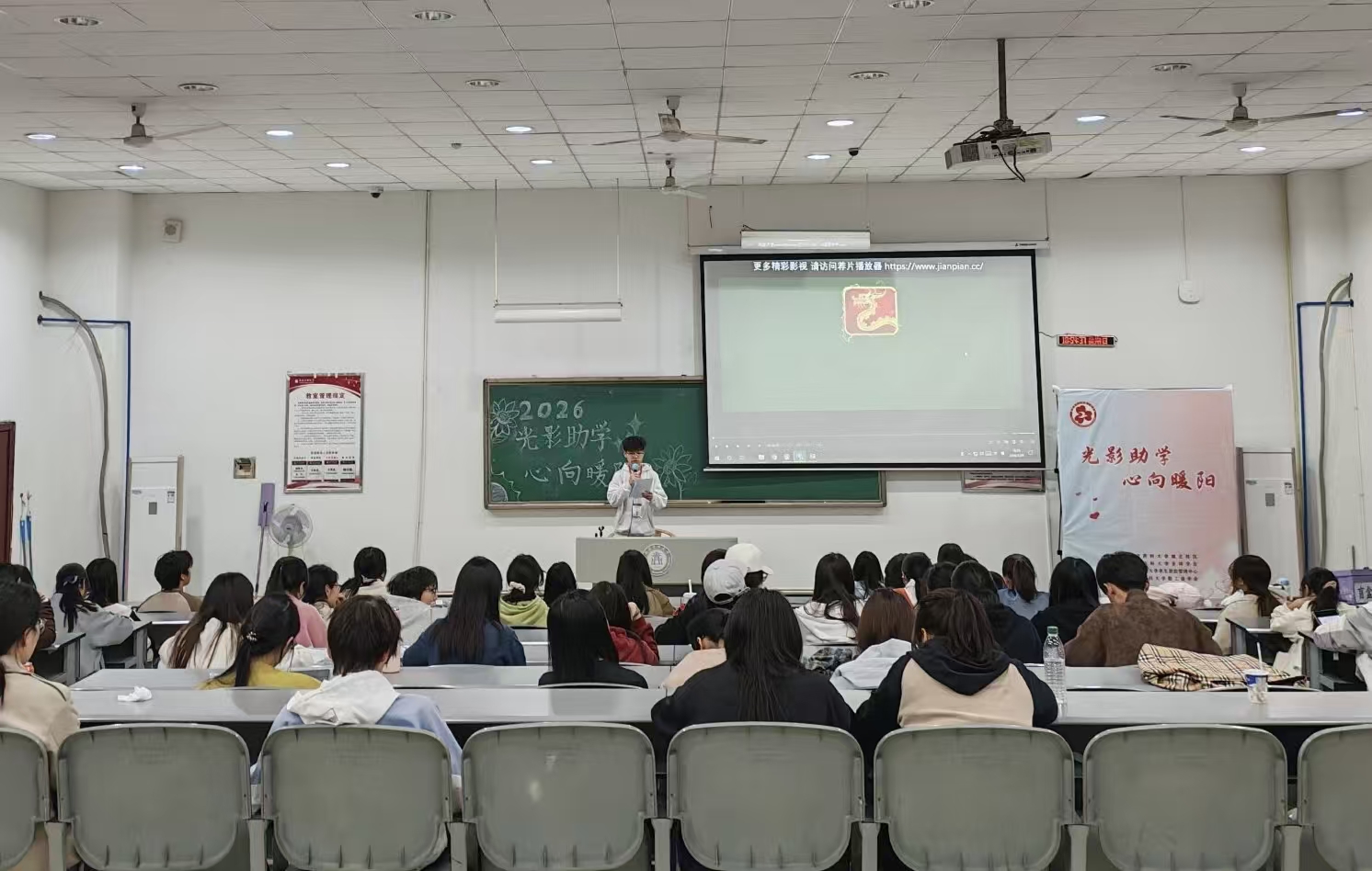 为加深学生对学生资助政策的理解,提升政策宣传实效,2026年3月29日晚,由学生资助管理中心主办、校勤工俭学会承办的“光影助学,心向暖阳”主题观影活动,在城北校区海川楼514教室顺利举行。